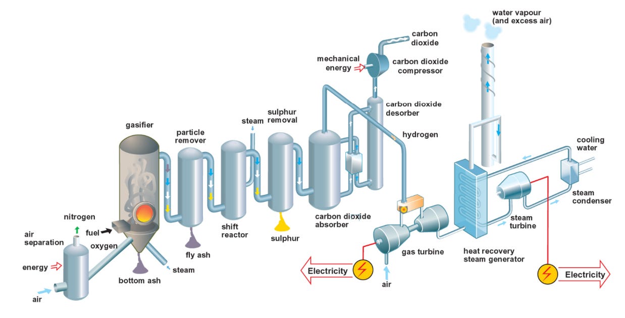 This sounds convoluted, perhaps; but the gist of it is that carbon-rich fuels have CO₂ siphoned from them in advance, leaving behind a hydrogen-rich gas that can be burned more cleanly. So to recap;