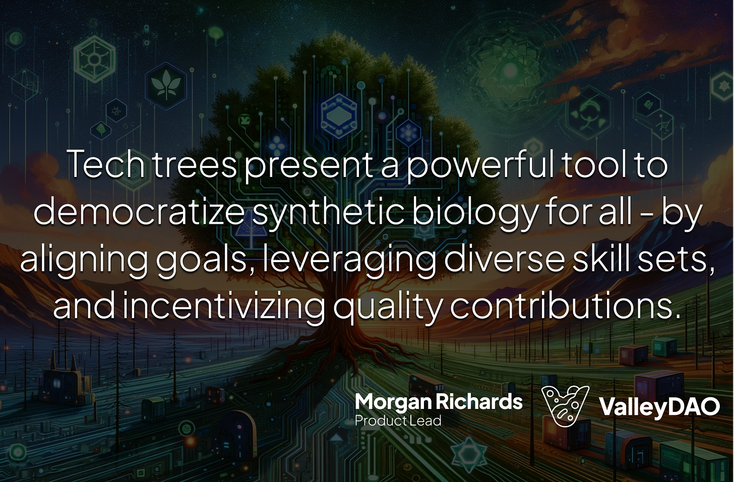For ValleyDAO, tech trees present a powerful tool for aligning goals, leveraging diverse skill sets, and incentivizing quality contributions. By structuring the creation process and implementing token-based rewards, we could encourage researchers to participate in building out these knowledge bases, creating a sustainable cycle of collaboration and discovery. This type of structure has benefitted us at ValleyDAO greatly since we embarked on this journey, allowing us to untether research from universities and think tanks and work towards democratizing SynBio research for all.