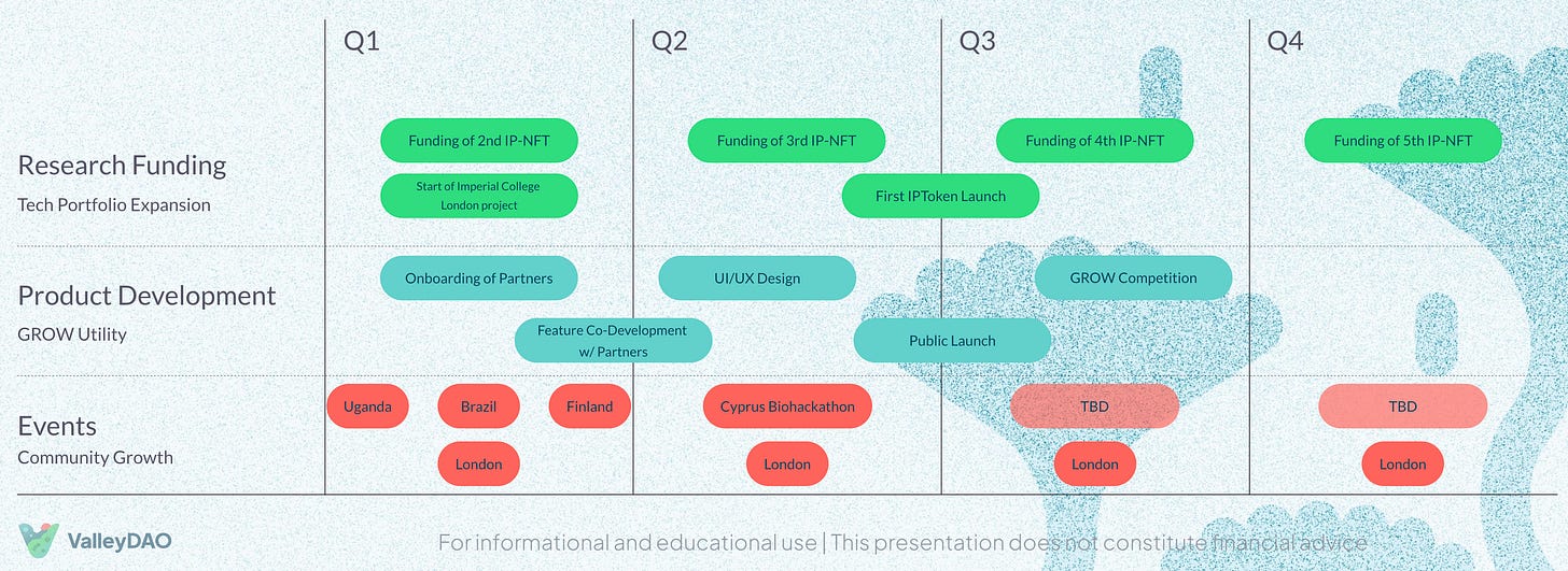 Possibly the most exciting milestone for 2024 is the launch of our community-driven research platform. We’re creating a community platform that enables true decentralisation of research translation where we seek to minimise bottlenecks in translational science. Building on lessons learned through growing the ValleyDAO community and the lessons of other organisations with similar objectives, we’re creating an online innovation ecosystem where individuals can find funding opportunities, collaborators/co-founders, job opportunities and claim bounties for solving bottlenecks. Our solution will make scientific community onboarding and engagement easier and more personalised, ensuring everyone is able to find their role in the ecosystem and maximise their individual impact towards a collective goal. Even more exciting is how all of this will be powered by the GROW token, ensuring that GROW continues to fuel innovation in synthetic biology for climate.
