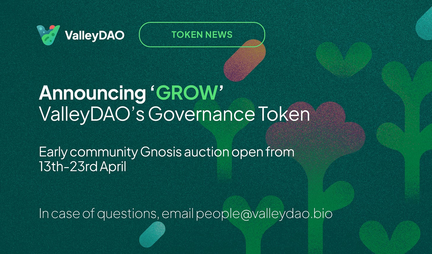 In order to truly create a community-governed ValleyDAO ecosystem, an ERC-20 token with the ticker “GROW” will be created on the Ethereum blockchain. The token will be used for voting on important matters such as electing work group leaders, selecting which research projects we fund, deciding how the resulting IP-NFTs are sub-licensed or commercialised, compensating contributors and enacting governance framework and rules.